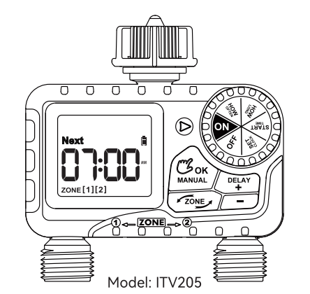 The ITV205-M247 is a 2-zone digital water timer designed to control two independent watering lines from a single faucet.